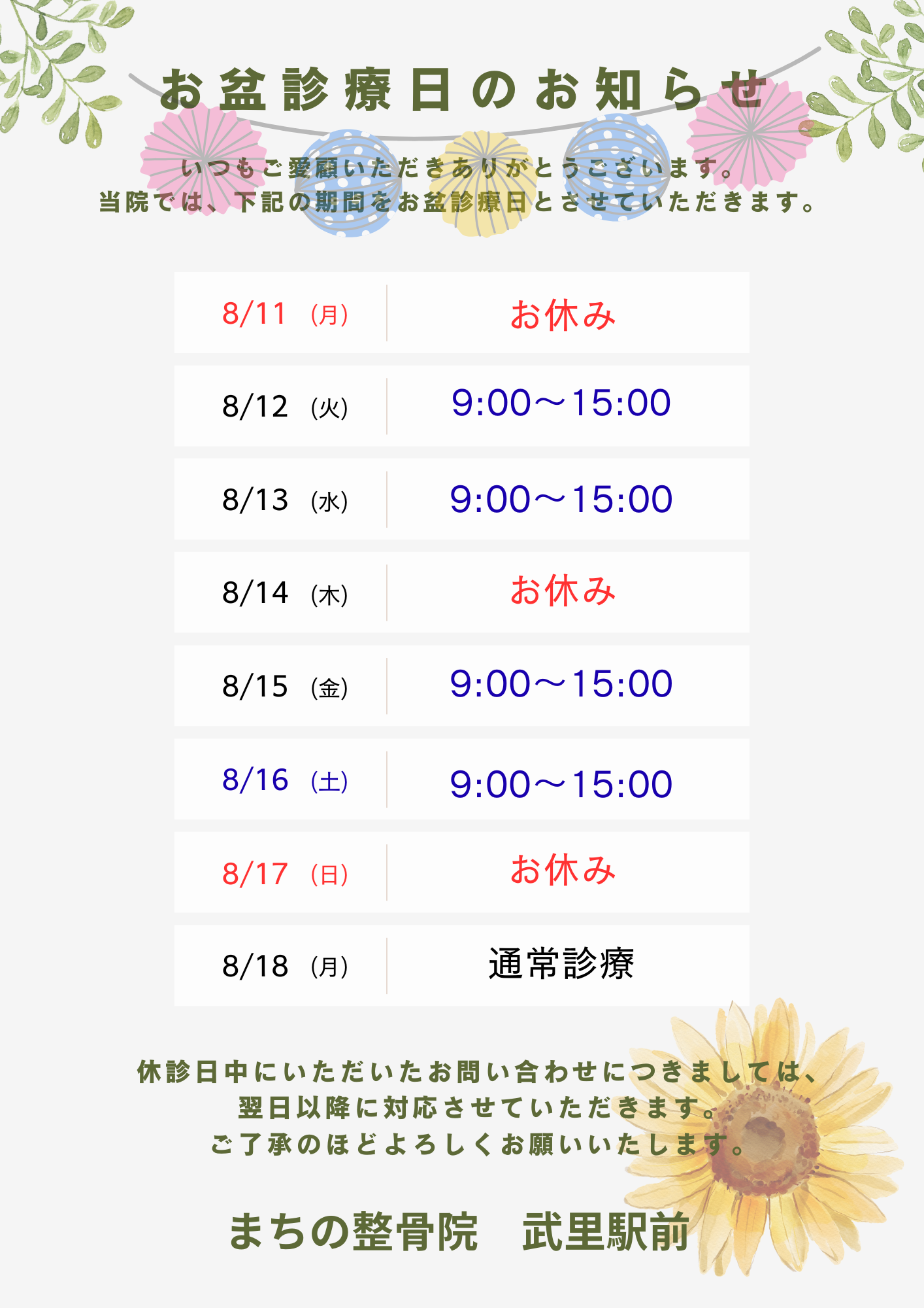 まちの整骨院武里駅前ではお盆中も下記の日程で診療しております。